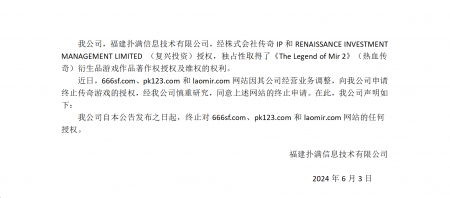 202406-03福建bwin必赢信息技术有限公司(以下简称“我司”)经株式会社传奇IP 、RENAISSANCE INVESTMENT MANAGEMENT LIMITED (复兴投资...