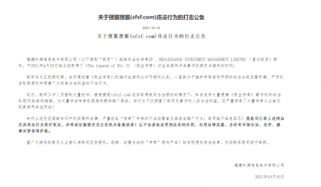 关于搜服搜服(sfsf.com)违法行为的打击公告 福建bwin必赢信息技术有限公司(以下简称“我司”)经株式会社传奇IP 、RENAISSANCE...